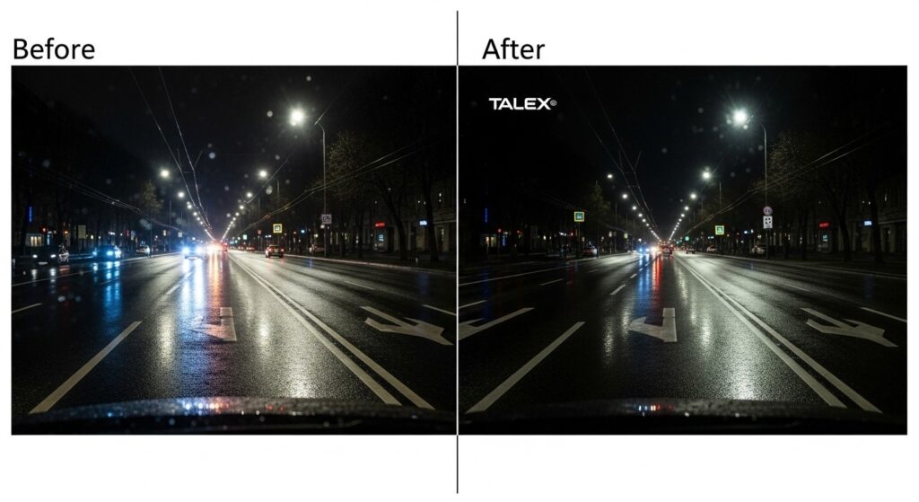 そう思いますよね。僕も最初はそうでした。でも、TALEXは全くの別物。一度このクリアな視界を体験したら、もうこれ無しで雨の日の運転は考えられなくなります。まさに「戻れない」という言葉がピッタリなんです。